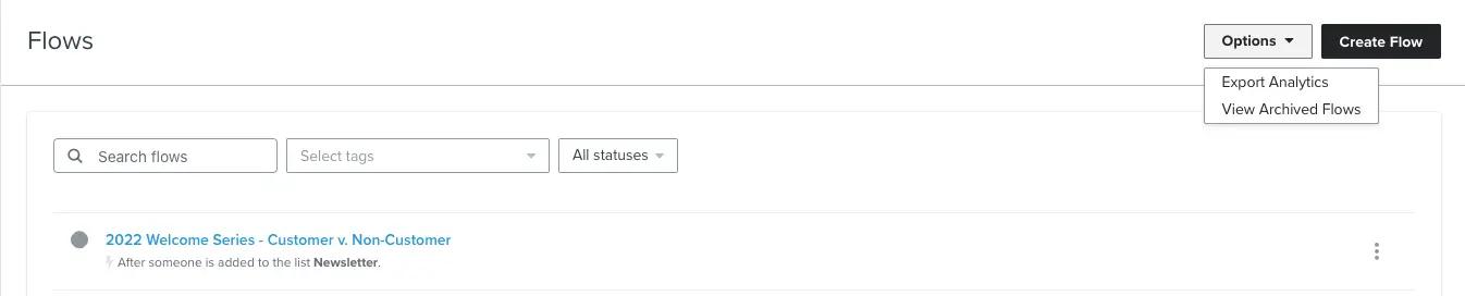 Imagine clicking into your flows page and seeing a wall of flows. Some haven’t been live in ages while others are sending all the time. Then you may have flows with content in development. That’s a lot of flows for you to look through, especially if you have a very specific item you’re looking for, like an old product review CTA.