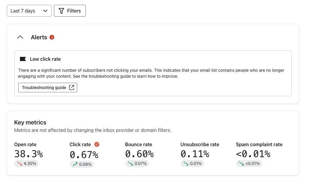 While it is great to have this centralized deliverability hub, not all marketers will be able to immediately recognize when a metric is a cause for concern. And for those that do, we know you don’t have time to constantly refresh the deliverability reports looking for issues. That is why Klaviyo built deliverability alerts that will let you know if a key metric is performing poorly, and proactively share troubleshooting guides on how to fix the specific issue. Klaviyo will alert you of the following: