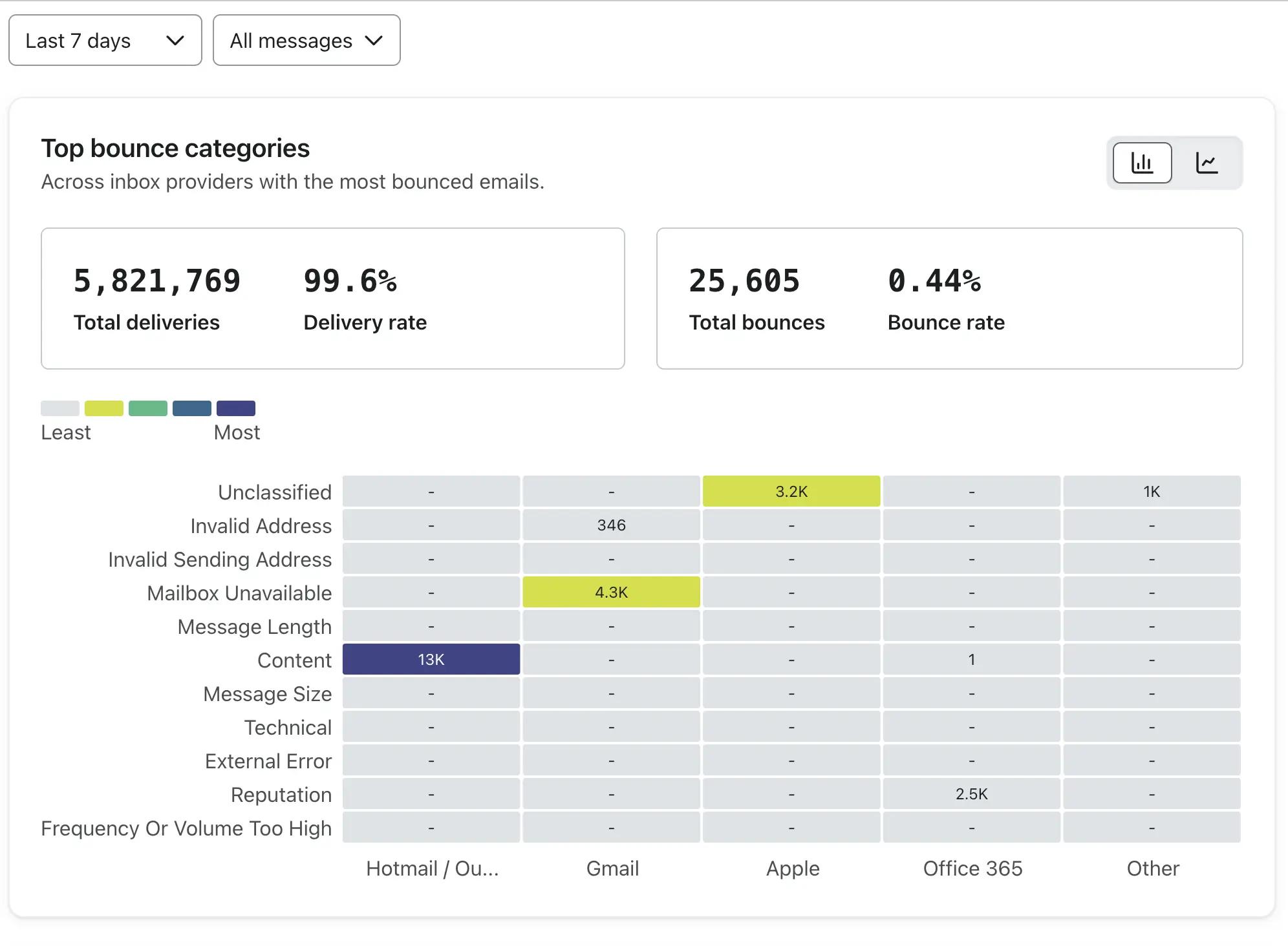 The Deliverability Hub even features a Bounce Details Report that provides an aggregated view of all email bounces and the reason for them. Knowing why your emails are bouncing, broken out by inbox provider, allows you to take action to improve your deliverability.
