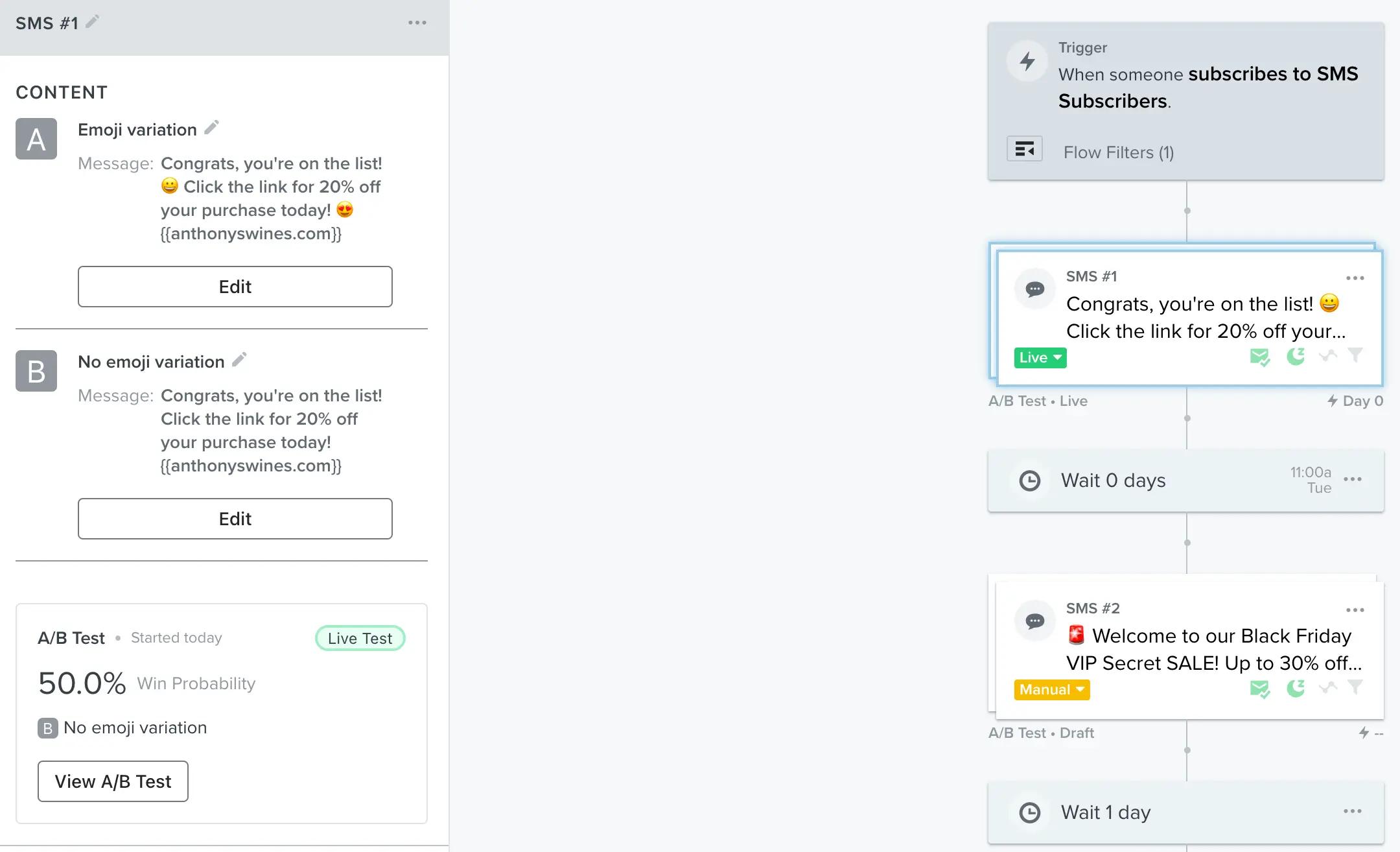 Setting up an A/B test for SMS messages in flows couldn’t be easier. It’s the same A/B testing process throughout Klaviyo that you already know and love — head to any flow with SMS, click on the message itself, and click ‘create A/B test’ to begin crafting the two content variations to test.