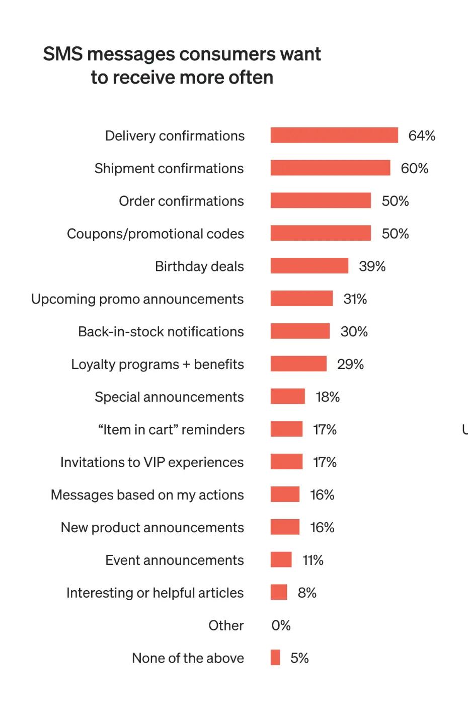 Primarily, SMS subscribers want to receive confirmations, with more than half selecting the following types of messages as preferable:
