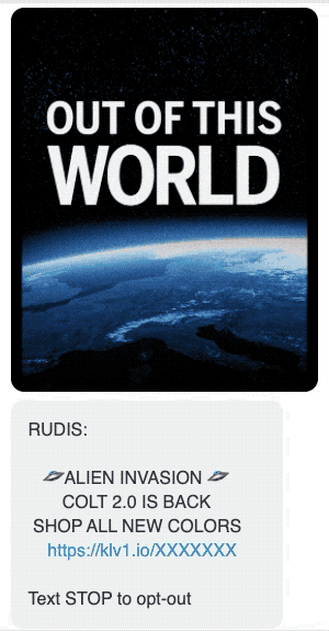 RUDIS reported high click-through rates on their SMS product announcement when they sent a gif to show off new colors for their Colt 2.0 shoe. It may not exactly be a gif you’d send to a friend, but the vibes are similar enough to catch someone’s eye if they’ve shown interest in a purchase, either through product page visits or newsletter clicks.