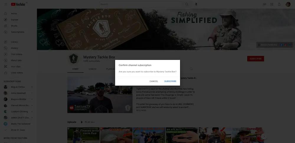 One thing we haven’t seen before is an automatic subscribe pop-up when you land on Mystery Tackle Box’s YouTube channel from their website. It’s a bold move that assumes you’re aware of the brand as a teacher of the sport if you’ve already visited the website.