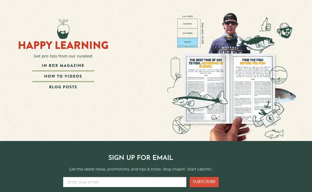 The Mystery Tackle Box website uses a learning preview section to encourage people to sign up for their email list. With fun illustrations and a sample image of their in-box magazine, Mystery Tackle Box disrupts the stereotype that says fishing is only for older men who have owned a boat for 30 years.