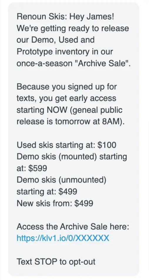 Renoun Skis uses their SMS list to give early access to their annual Archive Sale. This SMS campaign earned high click-through rates because the message called out the recipient’s name and gave them quick access to the sale a full 24 hours before the general public.