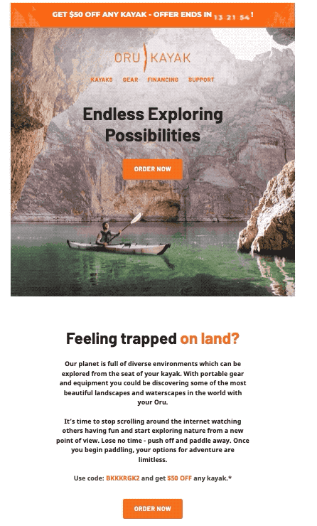 Oru Kayak’s newsletter expands on the established narrative of their welcome email. Their May 2022 edition uses a moving image of a lake to complement the headline “Endless Exploring Possibilities.” Email copy expands on the benefits in the welcome email: “With portable gear and sports equipment, you could be discovering some of the most beautiful landscapes and waterscapes in the world with Oru.”