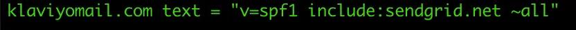 An SPF record starts with “v=spf1”. For example, if you do a TXT lookup for “klaviyomail.com”, you will find an entry like this: