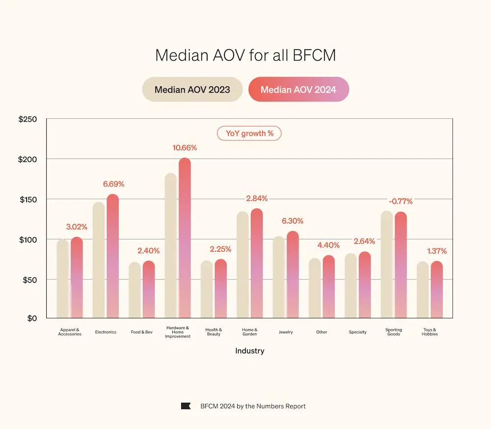 The hardware and home improvement industry earned the biggest AOV share and year-over-year jump, beating out inflation with an AOV increase above 10%. The electronics and jewelry industries, meanwhile, also saw significant growth in AOV.