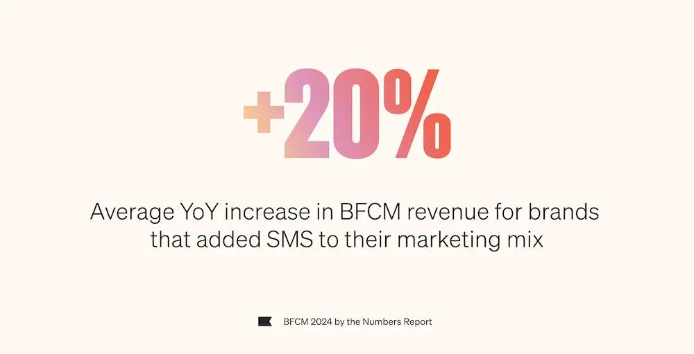 Klaviyo customers that added SMS to their marketing and CRM strategy this year, for instance, experienced a 20% YoY increase in ecommerce revenue this BFCM, accounting for more than $100M in GMV.