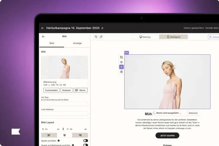 Remix ermöglicht es dir, Bilder direkt in Klaviyo zu bearbeiten. Passe Farben an, optimiere Produktfotos und bring deine Ideen schneller zum Leben.