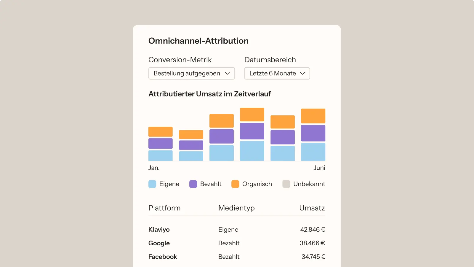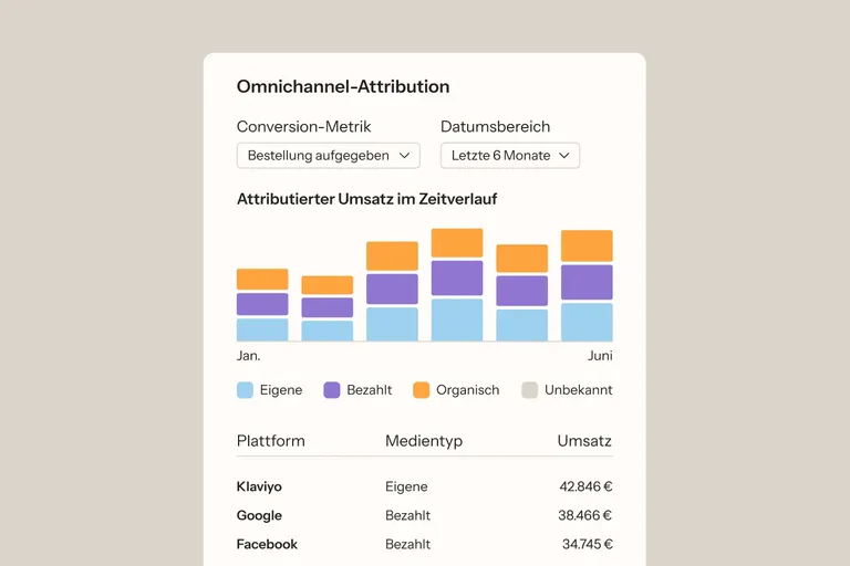 Die neue Omnichannel-Attribution von Klaviyo: Mach dir ein genaues Bild vom ROI deiner Marketing-Kanäle – von E-Mail und SMS bis zu Social Media und Anzeigen.