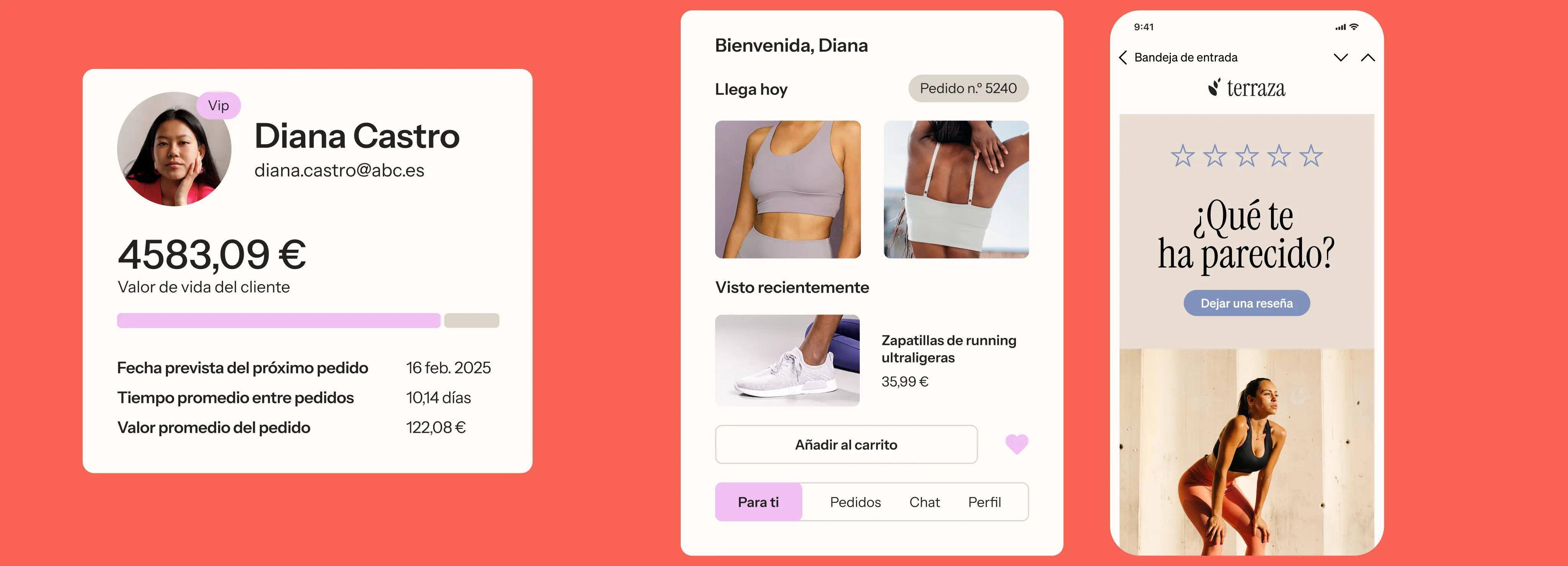 Este correo electrónico (que es el canal de comunicación preferido de María) se le envía a la hora que prefiere, lo que garantiza que llegue cuando es más probable que vaya a hacer una compra. Persuadida por las recomendaciones personalizadas y la oferta exclusiva, María vuelve a tu sitio web para terminar la compra. Incluso añade una bufanda a juego y gana puntos de fidelización que harán que vuelva otra vez.