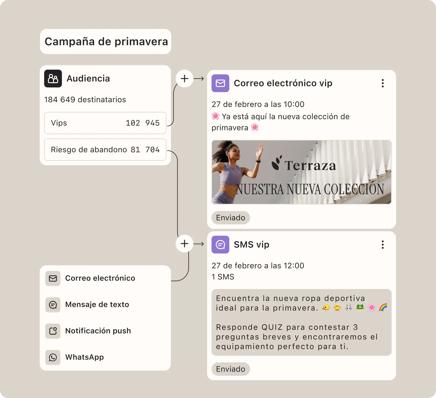 El marketing omnicanal es una estrategia que conecta todos los puntos de contacto de los clientes (como el correo electrónico y los SMS) en un recorrido ágil y en tiempo real. Utiliza perfiles de cliente unificados e insights basados en IA para enviar mensajes personalizados por los canales activos.