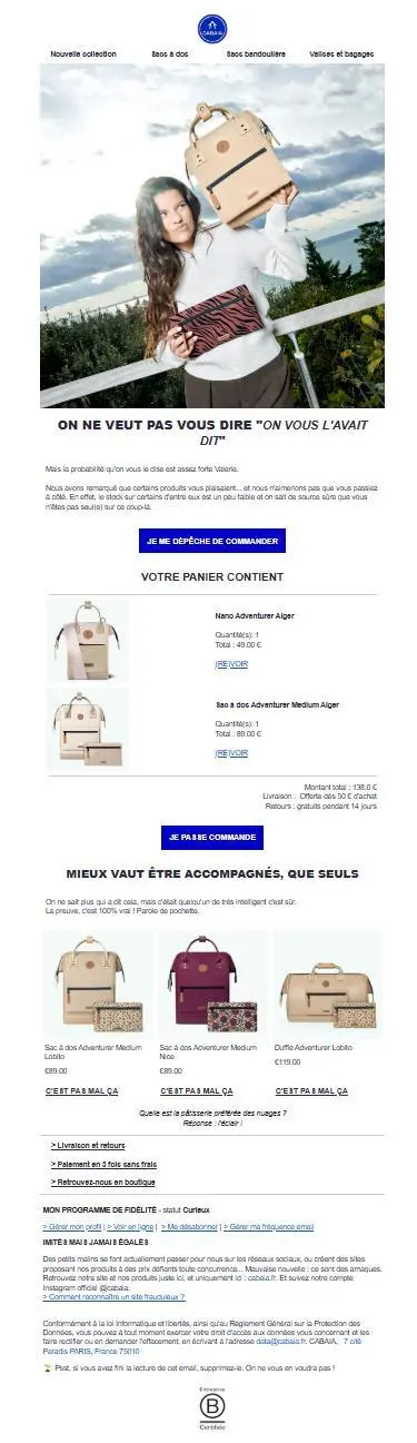 Cabaïa, marque française d’accessoires de voyage, propose une séquence de relance de panier abandonné exemplaire. En s’appuyant sur Klaviyo, la marque a mis en place un scénario automatisé en trois temps : un premier e-mail humoristique dans l’heure qui suit l’abandon, suivi d’un rappel le lendemain, puis d’un dernier message trois jours plus tard.