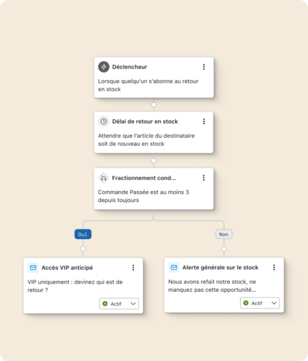 Ajoutez des notifications push, des e-mails ou des SMS à un flux pour créer un parcours personnalisé basé sur le comportement du client.