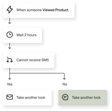 Ramenez davantage de visiteurs intéressés sur votre site en ajoutant les SMS à votre flux d’abandon de navigation. Les abonnés qui ont consenti à recevoir des SMS recevront leur rappel par SMS, tandis que les abonnés aux e-mails recevront leur rappel par e-mail.