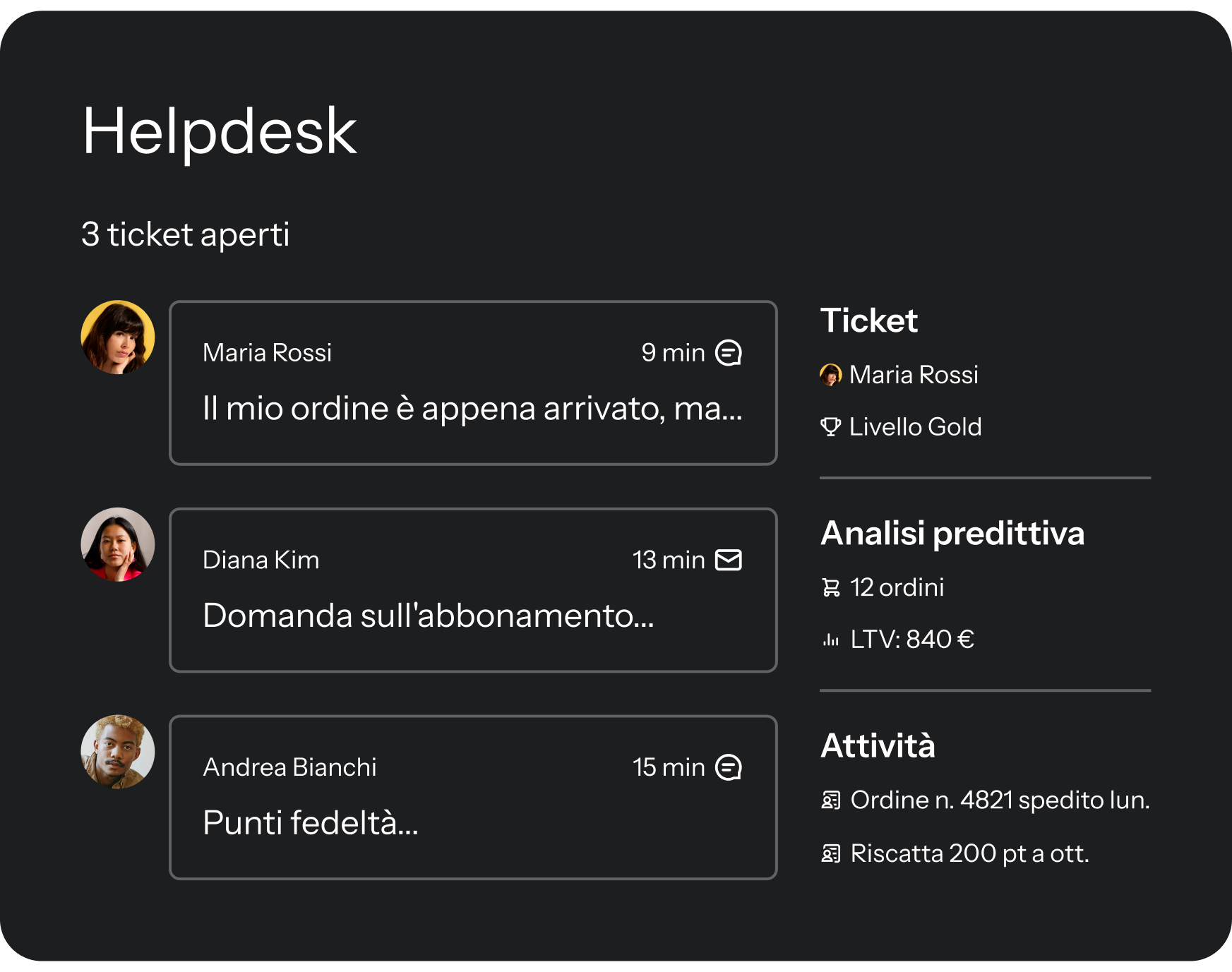 - Supporta i tuoi clienti ovunque ti contattino: tramite chat, e-mail, messaggi di testo, WhatsApp e social