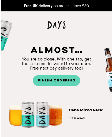 Days Brewing Co uses the CTA “finish ordering” alongside an encouraging message that tells shoppers they’re just one tap away from buying.