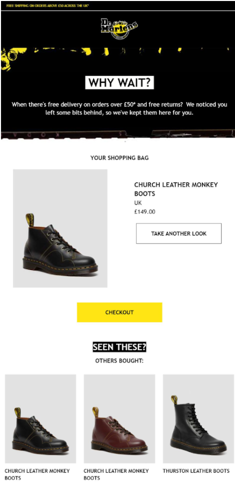 Here, Dr. Martens uses its casual, friendly tone of voice to win back customers who’ve left something in their cart.
