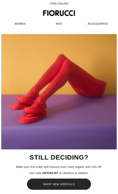 Clothing brand Fiorucci takes it one step further by sending a browse abandonment email that asks shoppers if they’re still deciding and provides a discount they can use on their first purchase.