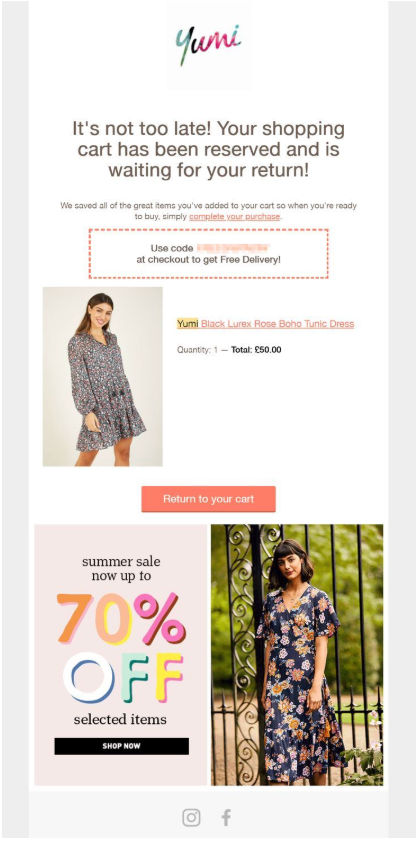 Here, clothing brand Yumi offers free delivery to cart abandoners and highlights the offer at the top of the email.