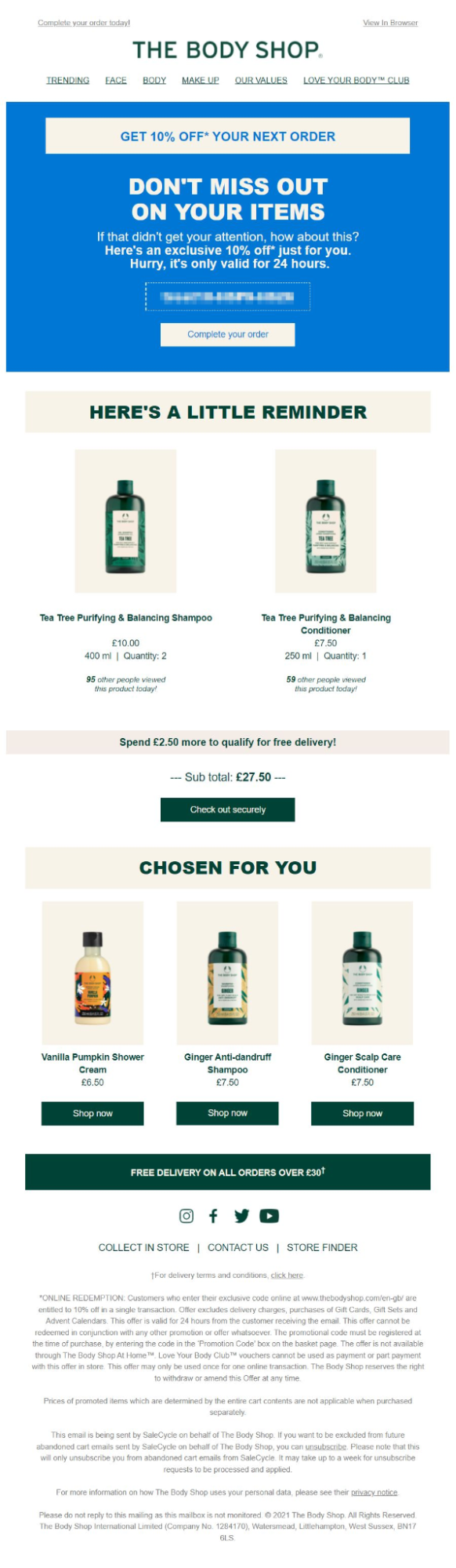 In this abandoned cart email, The Body Shop does an excellent job of following this guidance. As well as reminding customers that they have products in their cart, the brand also shares some personalised product recommendations.
