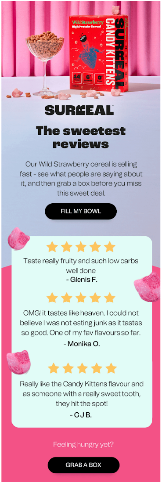 You can also include star ratings and even social media mentions to convey authenticity and build trust. This cart abandonment email from cereal brand Surreal uses both star ratings and customer reviews.
