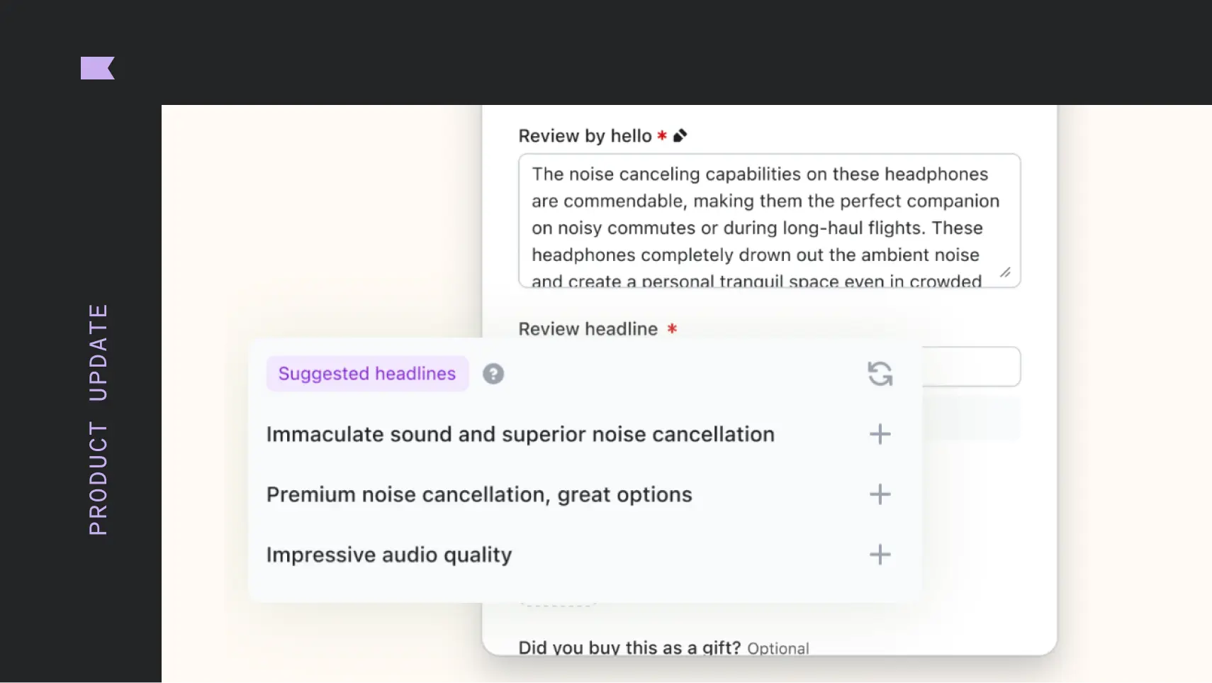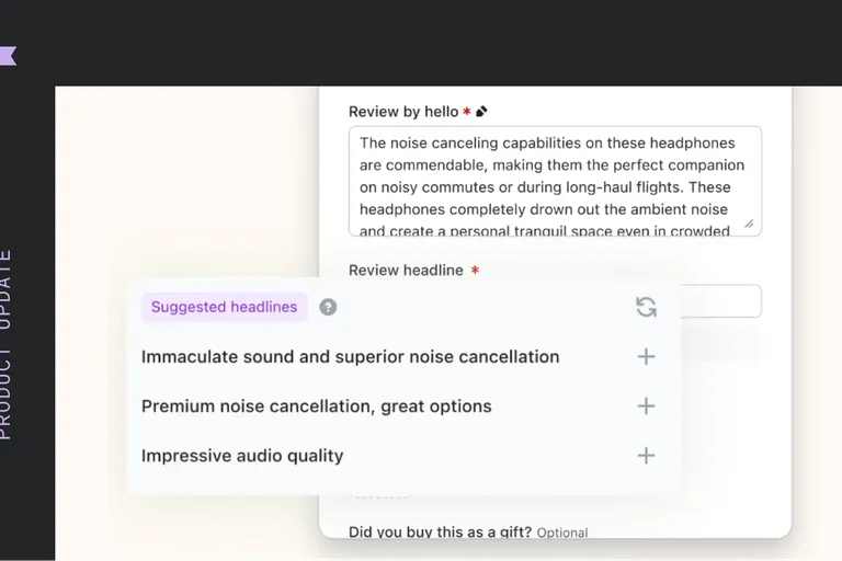 Klaviyo is bringing the power of AI to reviews. We now show shoppers AI-suggested headlines based on the content of their review – enabling them to click submit much faster.