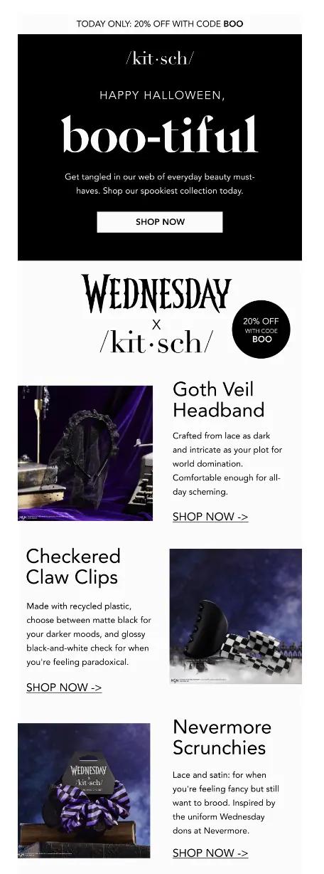 Kitsch, a brand that sells hair and beauty products, takes this seasonal email as an opportunity to have fun with their product details with spooky names while also flagging the unique properties of their products.