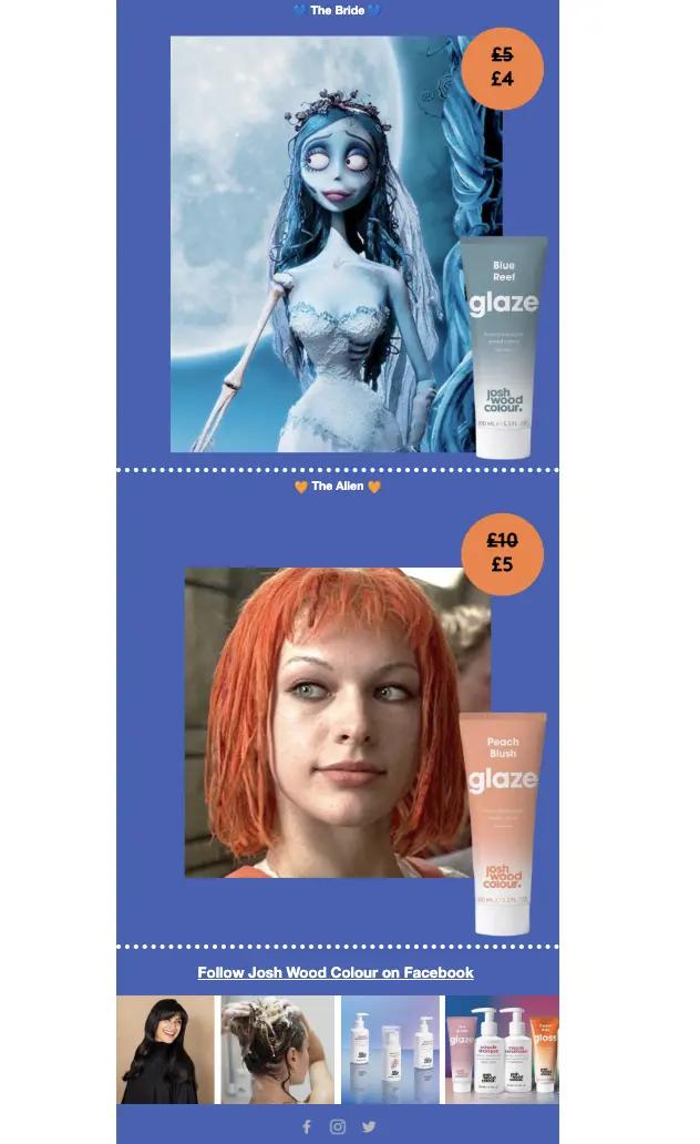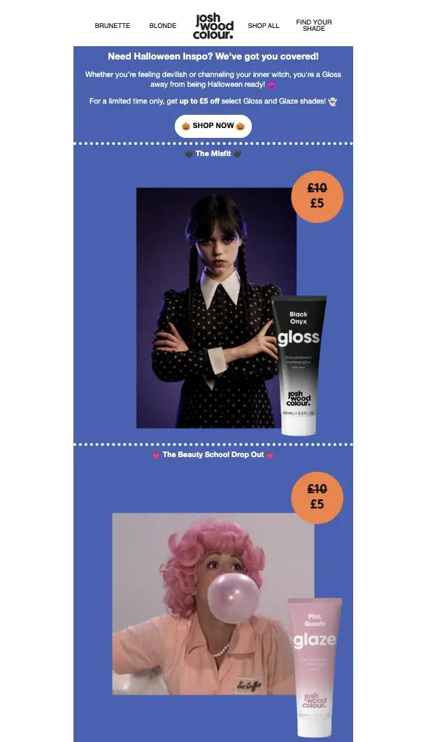 In this Halloween email, hair care brand Josh Wood Colour pairs their team’s cosy, in-home Halloween evenings with their movie favourites. You may not think Halloween and hair products are a match made in heaven, but Josh Wood Colour makes it work by focusing on their spine-chilling film recommendations and the creepy characters that subscribers can relate to (in terms of hair, at least).