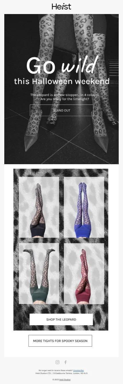 Heist, a fashion brand that specialises in women’s base layers, uses this Halloween email to launch a Halloween collection.The email includes high-quality product close-ups and links above the fold that take the subscriber directly to the relevant product pages.