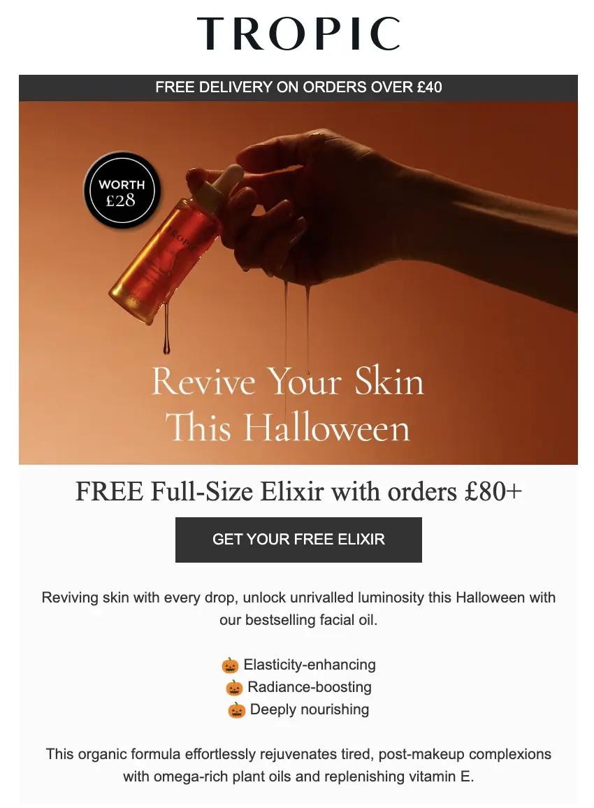 With the added touch of the dripping bottle, Tropic Skincare visually evokes the Halloween spirit—while keeping the copy of their Halloween email short and sweet.