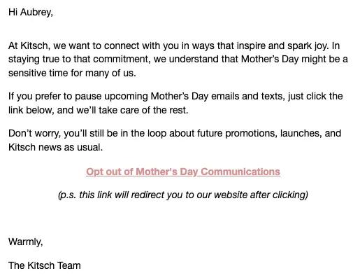 A Mother’s Day opt-out email is peak customer empathy. This example from beauty brand KITSCH is simple and sensitive, and it puts the power of choice in the hands of the customer.