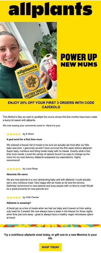 allplants, a plant-based recipe brand, empathises with tired mums by highlighting how their products can help new and time-poor mums have fast, delicious, and healthy meals.A bold, direct header image and copy—”Power up new mums”—and a discount that’s bound to make the reader take notice—precede the gushing reviews that do wonders for the brand’s credibility.
