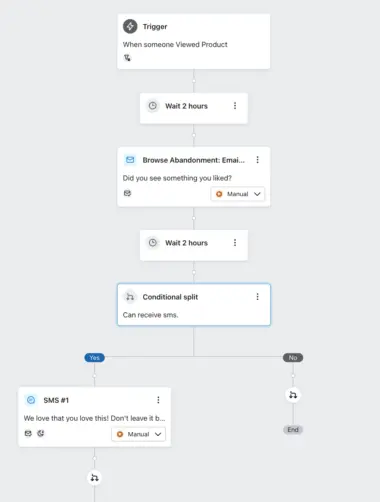 If you’re cost-conscious, remember: Sending an email costs less than a text. Seeing if your subscriber will engage with an email first, then following up with a text if they don’t, is an especially smart strategy for lower-intent flows like browse abandonment.