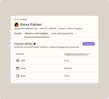 NEW Channel affinity: Klaviyo AI learns how each customer interacts with various channels, so you can route each message through the channel that will maximise its impact.